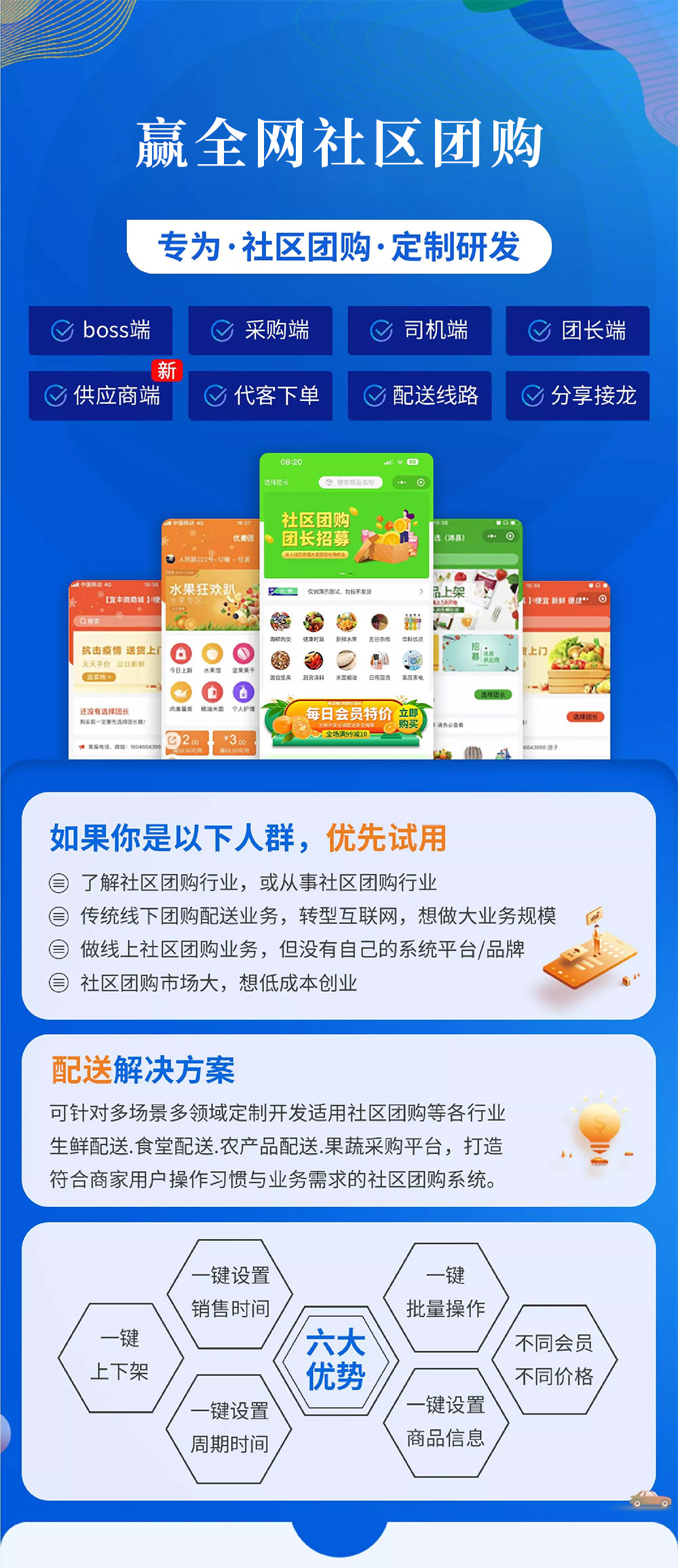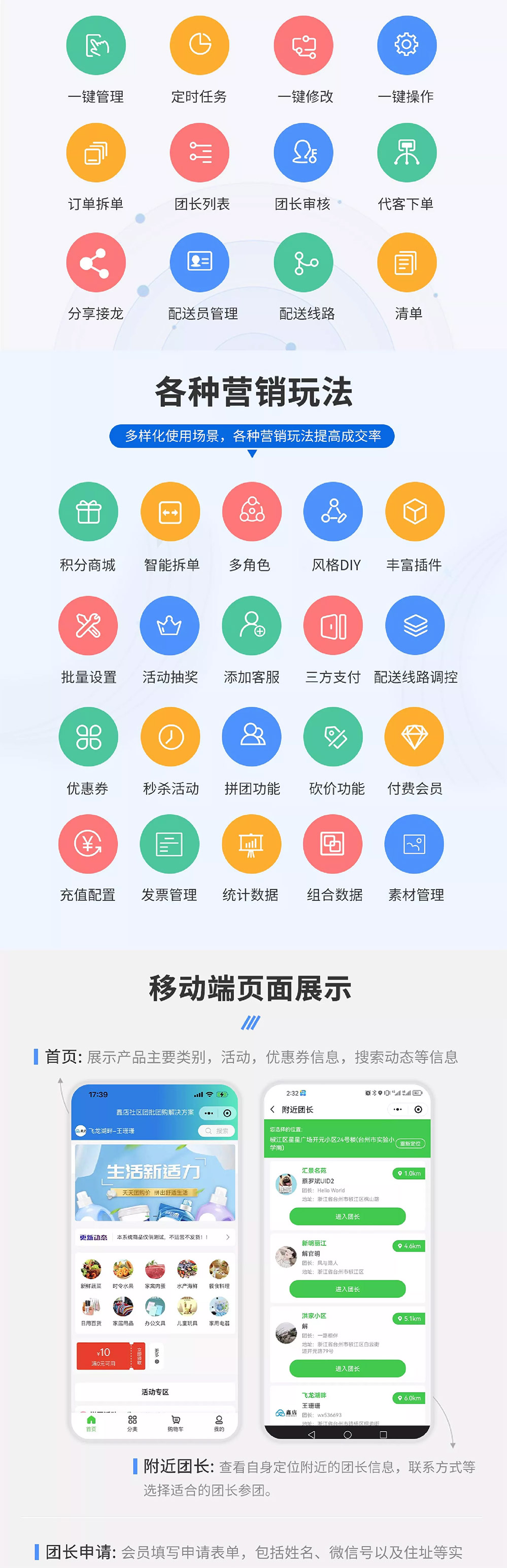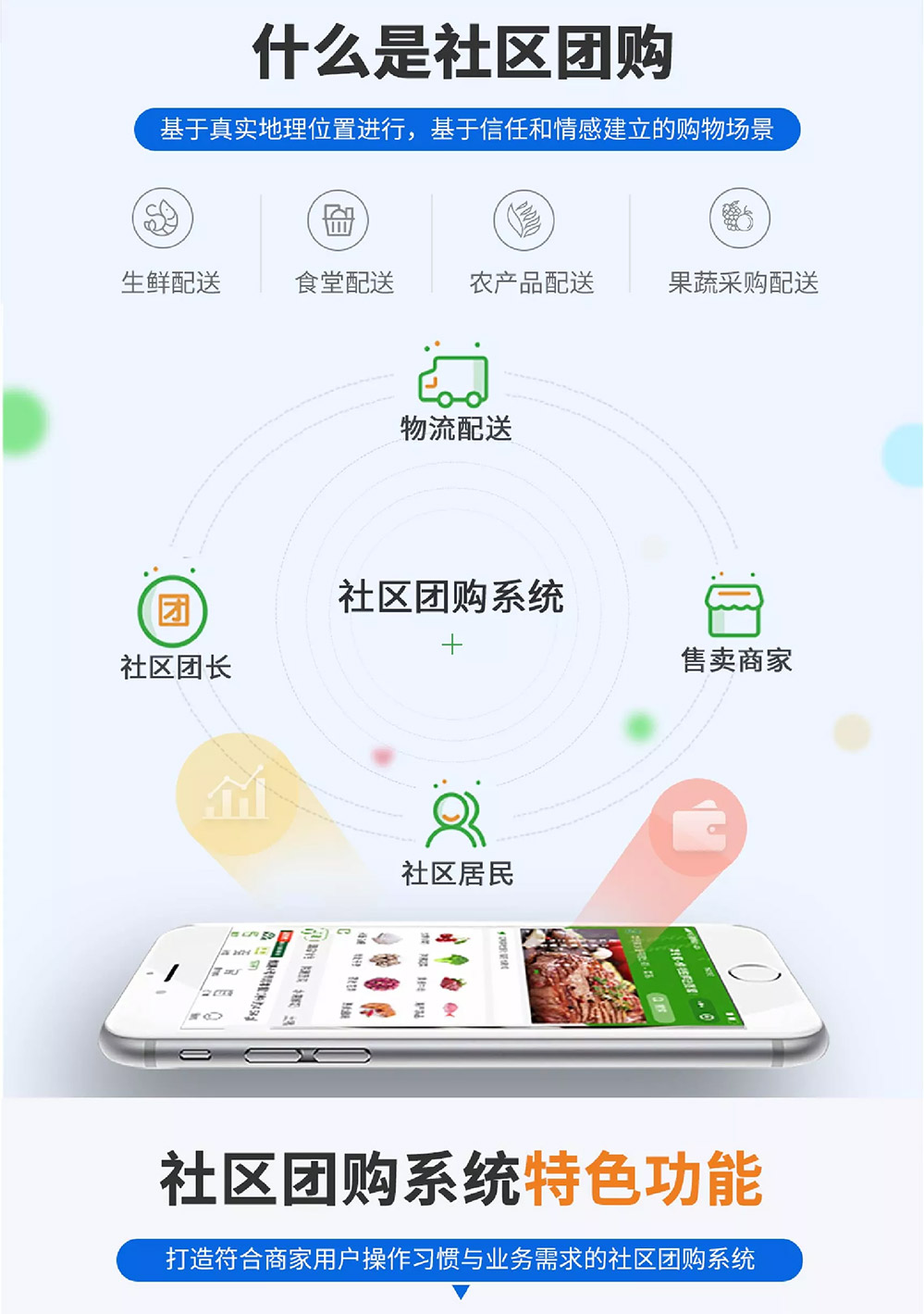 产品说明:社区团购系统可针对多场景多领域定制开发适用社区团购各行业生鲜配送、食堂配送、农产品配送、果蔬采购平台,打造符合商家用户操作习惯与业务需求的社区团购系统